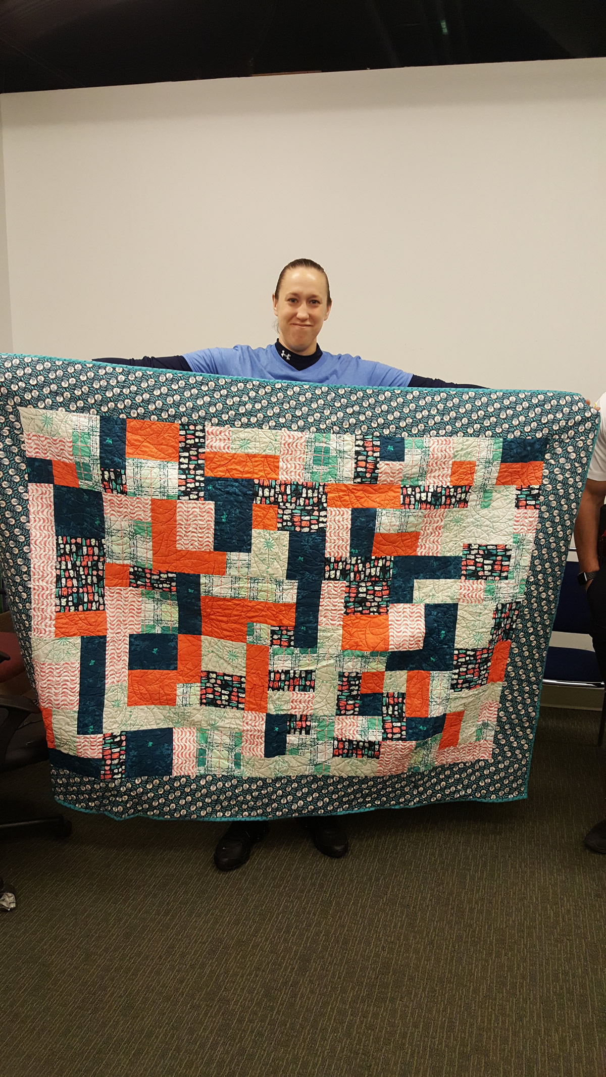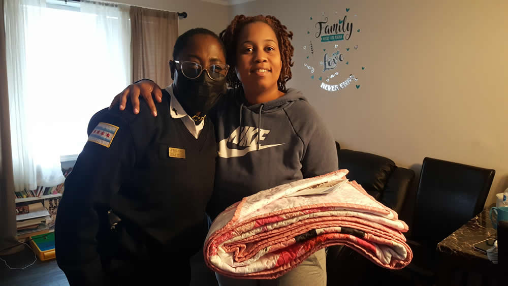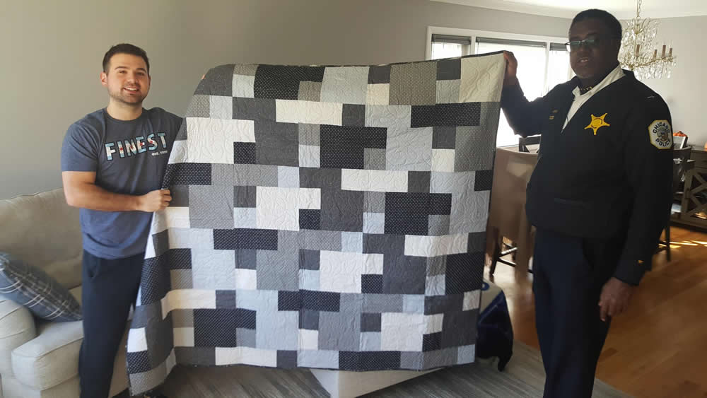 ![]() August 18, 2021: Chicago Police Officer Jordan Hartfield of the 007th District was presented a quilt by Chicago Police Chaplain Joseph Jackson on behalf of Quilts for Cops. Quilts for Cops is a nationwide origination with a team of volunteers who handmakes quilts for officers injured in the line of duty. September 18, 2020: Officer Hartfield and his partner were on an investigatory traffic stop. At which point the offender fled on foot and Officer Hartfield chased after the fleeing offender. During the course of the foot pursuit, Officer Harfield fell, causing injury to his right femur. |