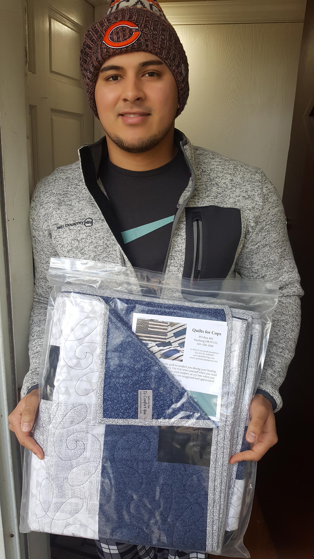 18 May 2021: Chicago Police Officer Joel Gordils was presented a handmade quilt by Chaplain Hysni Selenica and Chaplain Robert Montelongo on behalf of Quilts for Cops. 23 November 2020: Officer Gordils and his partner conducted a traffic stop when Officer Gordils approached the driver side of the vehicle. At which point the offender drove off as Officer Gordils got stuck in the door. The offender continued to drive and accelerated at a high rated speed dragging Officer Gordils down an entire city block and crashing into a street pole. At which point Officer Gordils then ejected several feet from the vehicle. Officer Gordils was crucially injured on multiple levels during this tragic incident. |