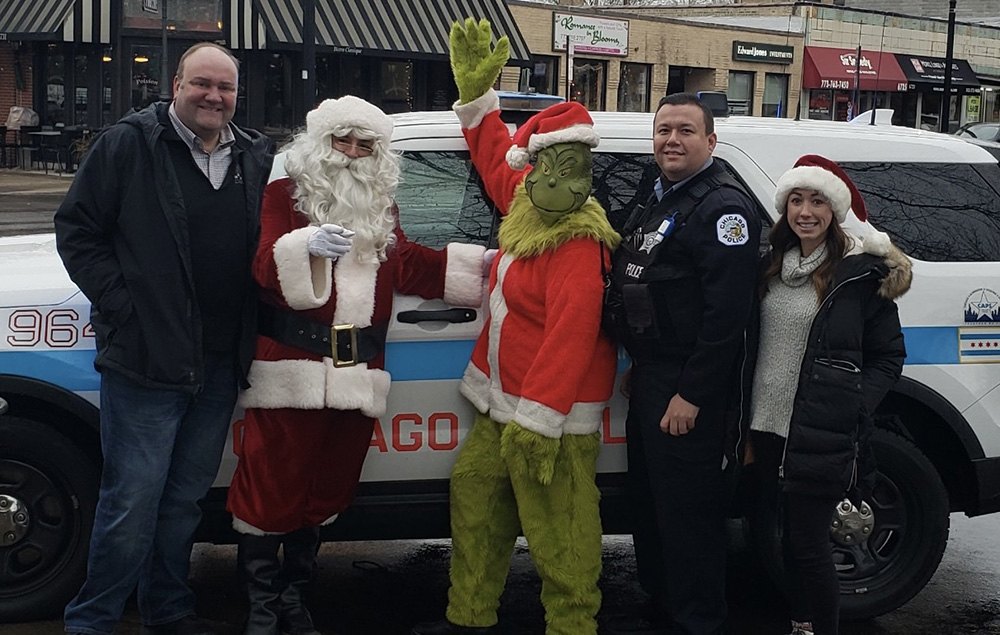 ![]() 05 DEC 2021: The Edison Park Chamber of Commerce hosted a Christmas tree blessing and lighting ceremony. At the event, Chamber director Amanda Harres, Santa Claus and I witnessed PO Peter Palka (016 CAPS) “Pinch The Grinch.” Here you’ll see Officer Palka placing The Grinch into custody. Good work, Peter! You saved Christmas. |