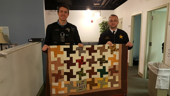 ![]() Jan. 16, 2021: Chicago Police Sgt. Shannon Martin presents a handmade quilt on behalf of Quilts for Cops to Officer William Taylor. Chaplain Hysni Selenica offered an introduction and some words of wisdom during this presentation. July 17, 2020: Officer William Taylor was injured while in the performance of his tour of duty in Grant Park guarding the Columbus statue, when several protesters and rioters threw many objects at the officers, causing injuries to several officers. Thanks to the entire Quilts for Cops team for your service in bringing comfort and a smile to all officers. |