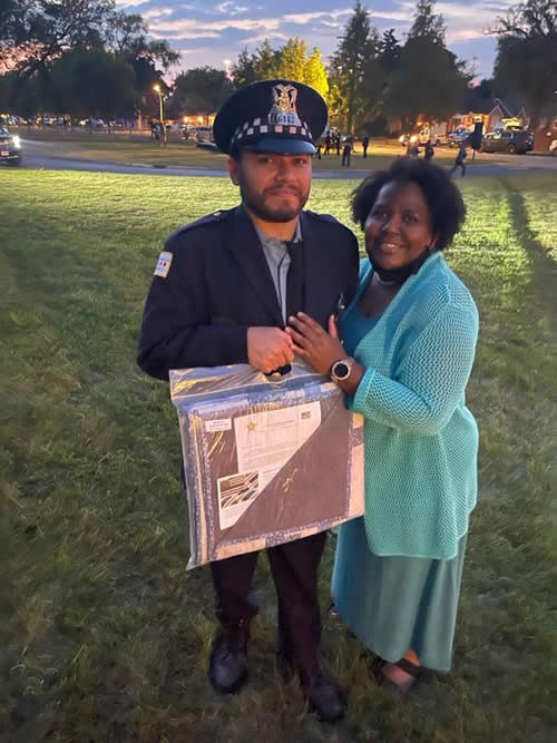 ![]() September 1, 2021: Chicago Police Officer Veronica Franco was presented a handmade quilt by Chaplain Hysni Selenica on behalf of Quilts for Cops. June 2, 2021: Officer Franco and her partner were responding to an emergency call. At which point a vehicle struck them while crossing the intersection at 63rd and Cornell. Causing their vehicle to turnover. |